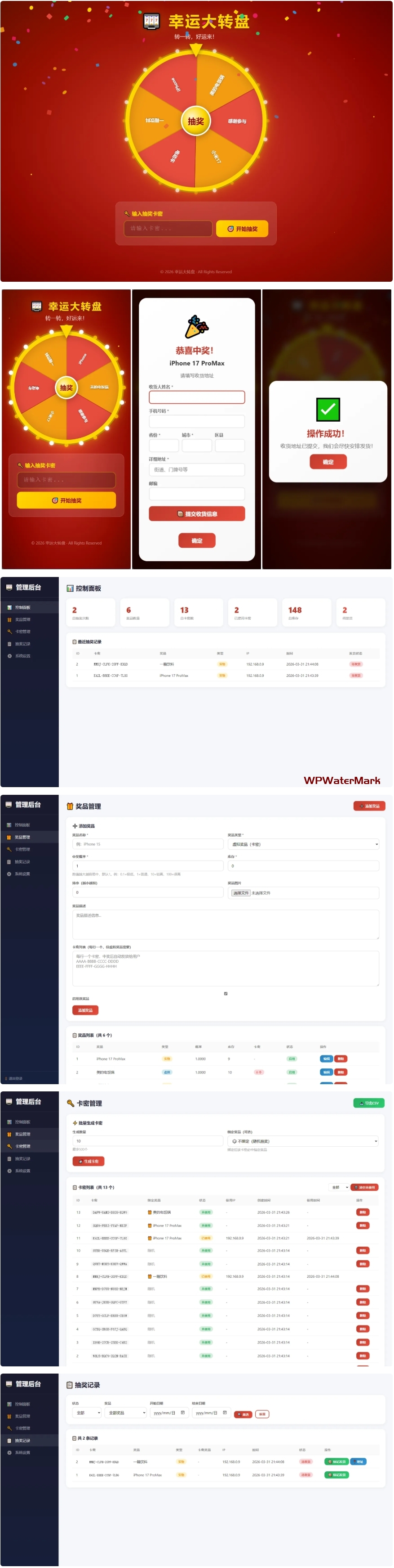 奖品管理** — 支持虚拟卡密奖品和实物奖品