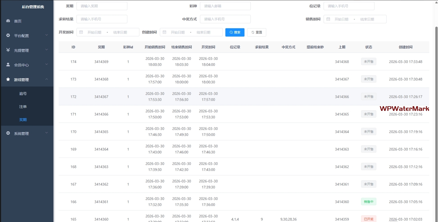 安全封盘机制**:系统设定了“销售截止时间”。一旦到达此时间(早于实际开奖前三十秒等),本期奖期状态由 `销售中` 转为 `封盘`,拒绝新投注进入同时开启下一期下注通道。