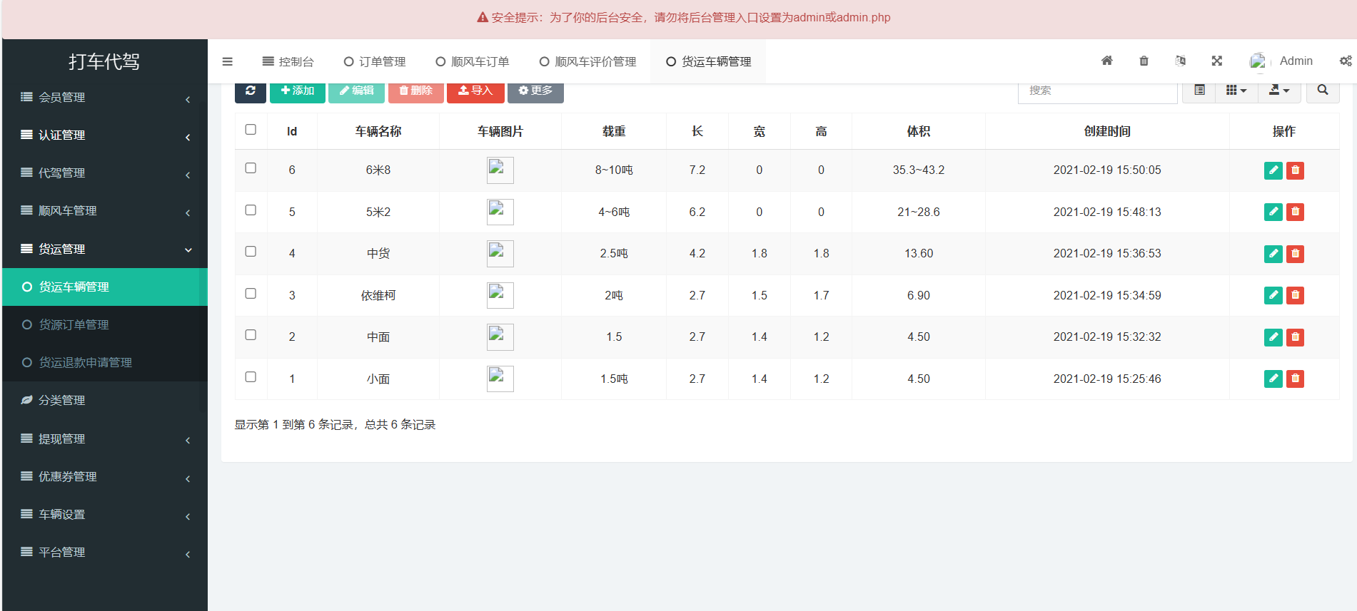 - 顺风车管理:顺风车订单管理、顺风车评价管理和车主管理。