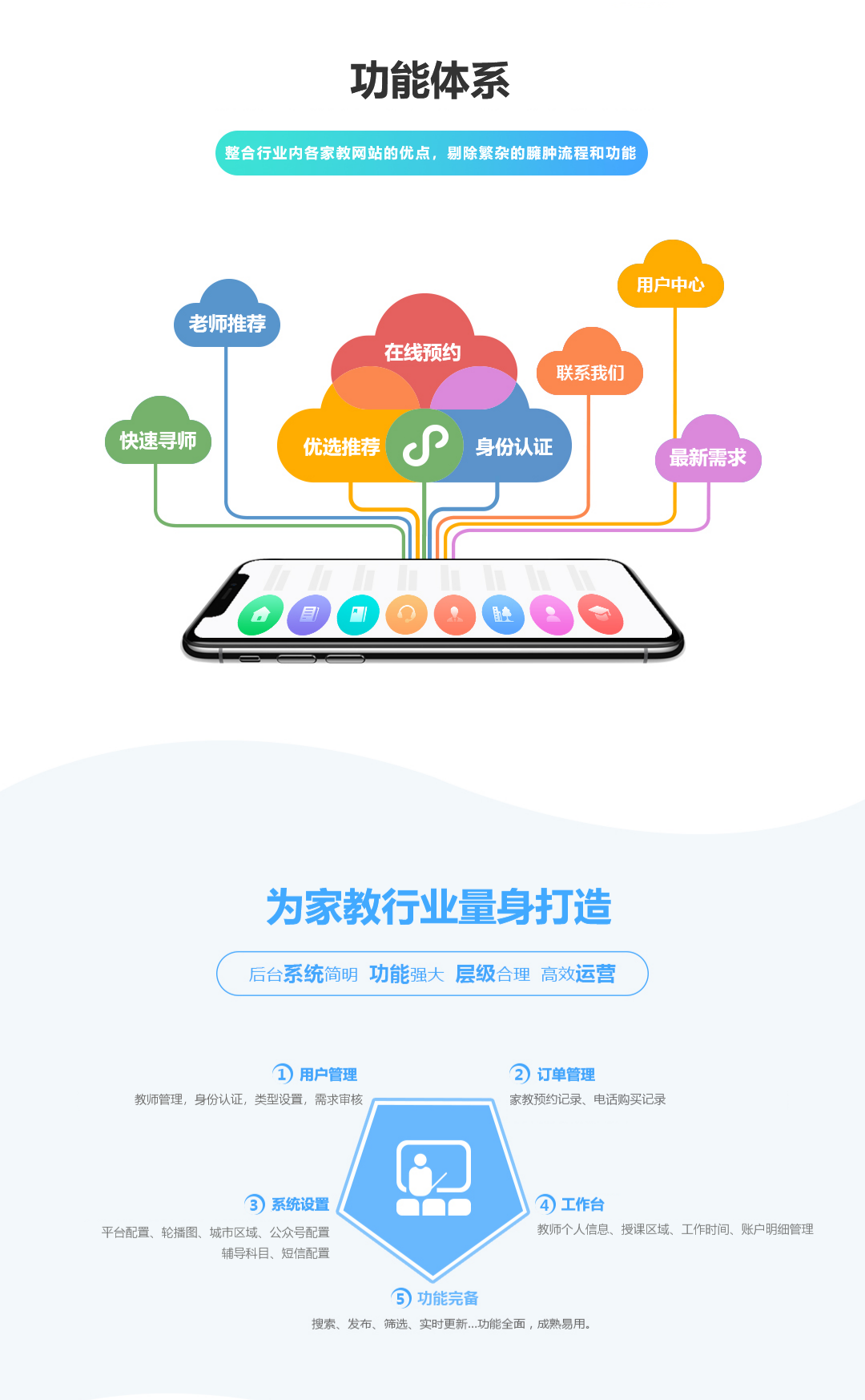 - 教师管理模块:支持教师信息录入、资质审核与课程设置,教师可管理个人资料、上传教学证书,并灵活发布课程时间表,系统自动同步可用档期。