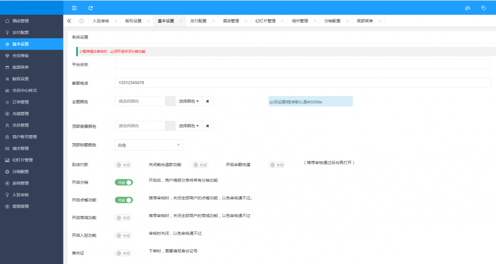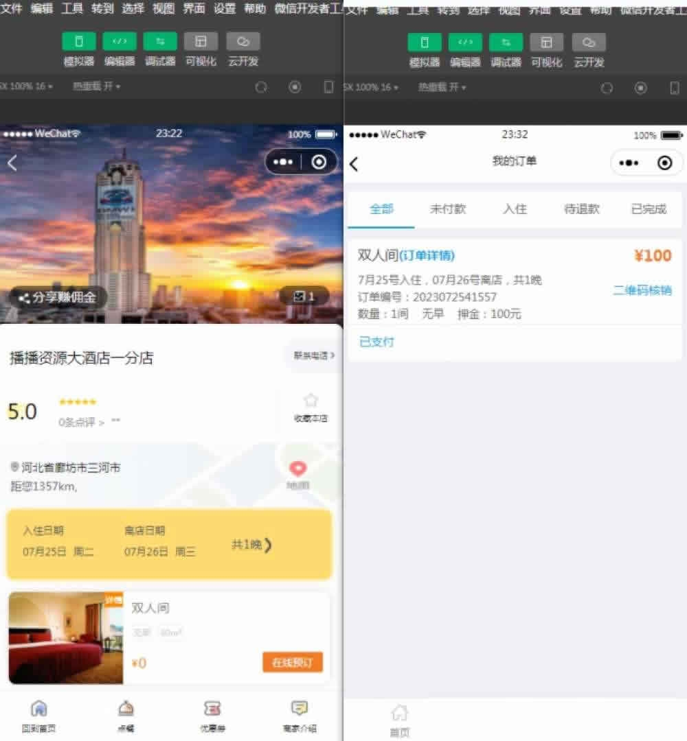 酒店多商户小程序是基于框架应用模块应用,需要微擎框架基础上使用,总体体验了一下功能还是强大,非常酒店及民宿类小程序搭建。小程序端支持多店版支持平台入驻。手边酒店多商户版只有模块版,无版本,该版本核心是全开源,支持多商户入驻,同时修复了下新的用户方式,开发工具基础库建议选择2.27.3,系统支持无限多开小程序。后台支持二级分销、会员等级、酒店点餐、首页DIY装修、订单邮件消息几种方式提醒、营业汇总、文章营销,基本上能这行业的需求了,小程序端用户也是采用新接口,可随时同步使用新版本。