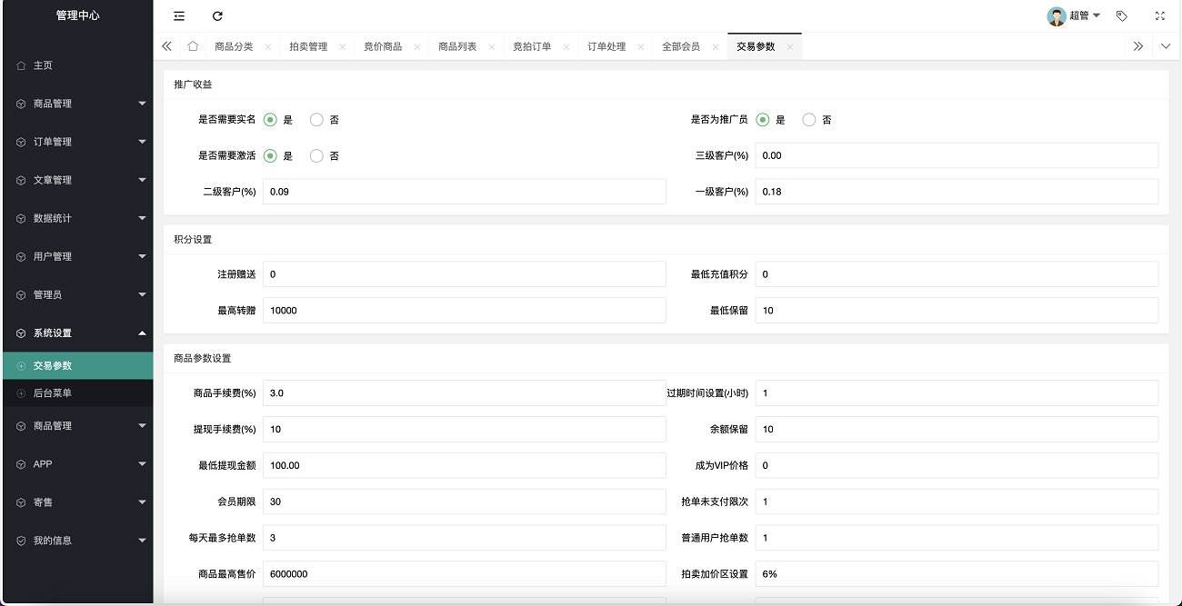 整套程序主要以拍卖挂售为主,然后就是积分商城,没有新奇的功能