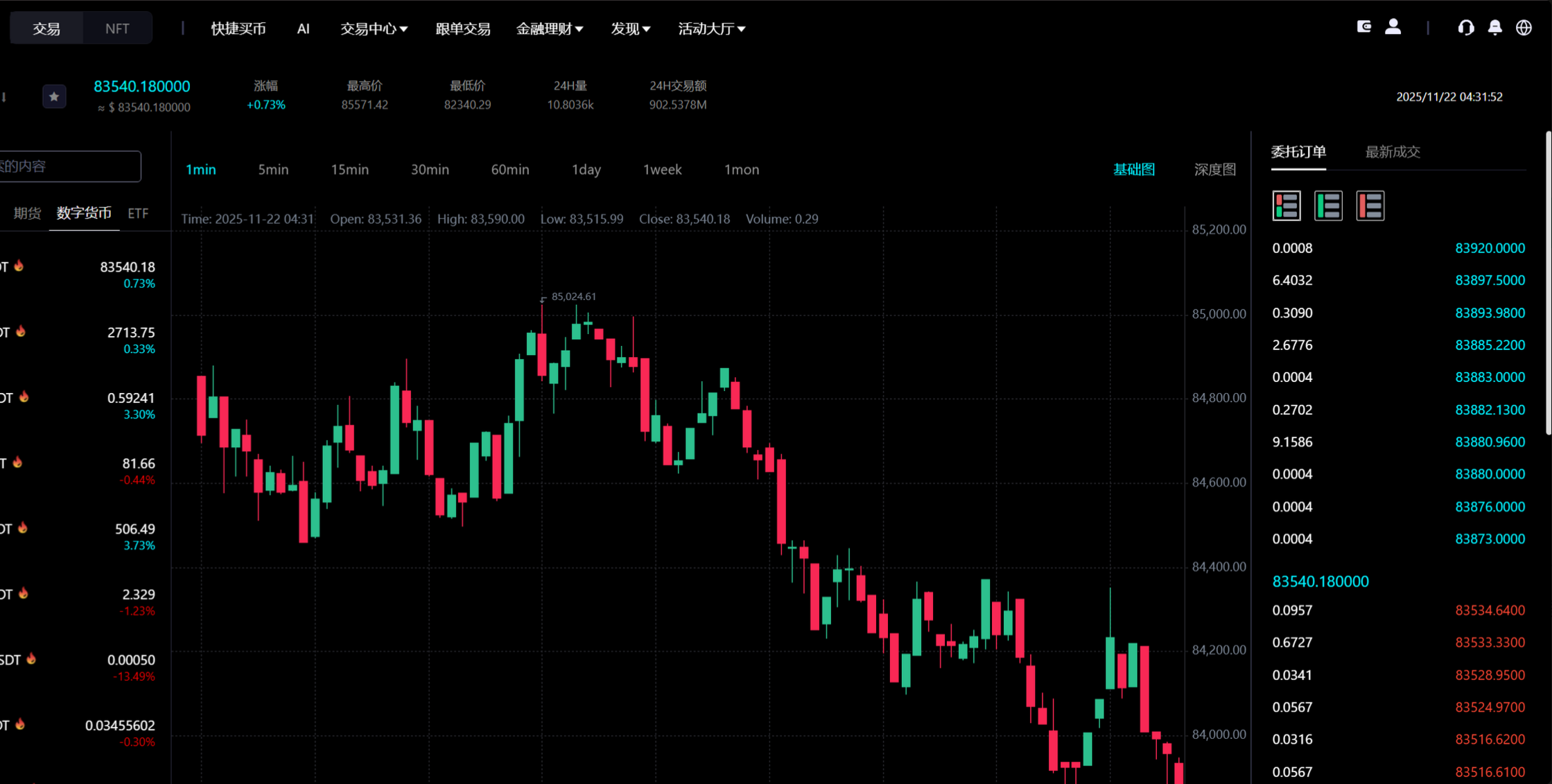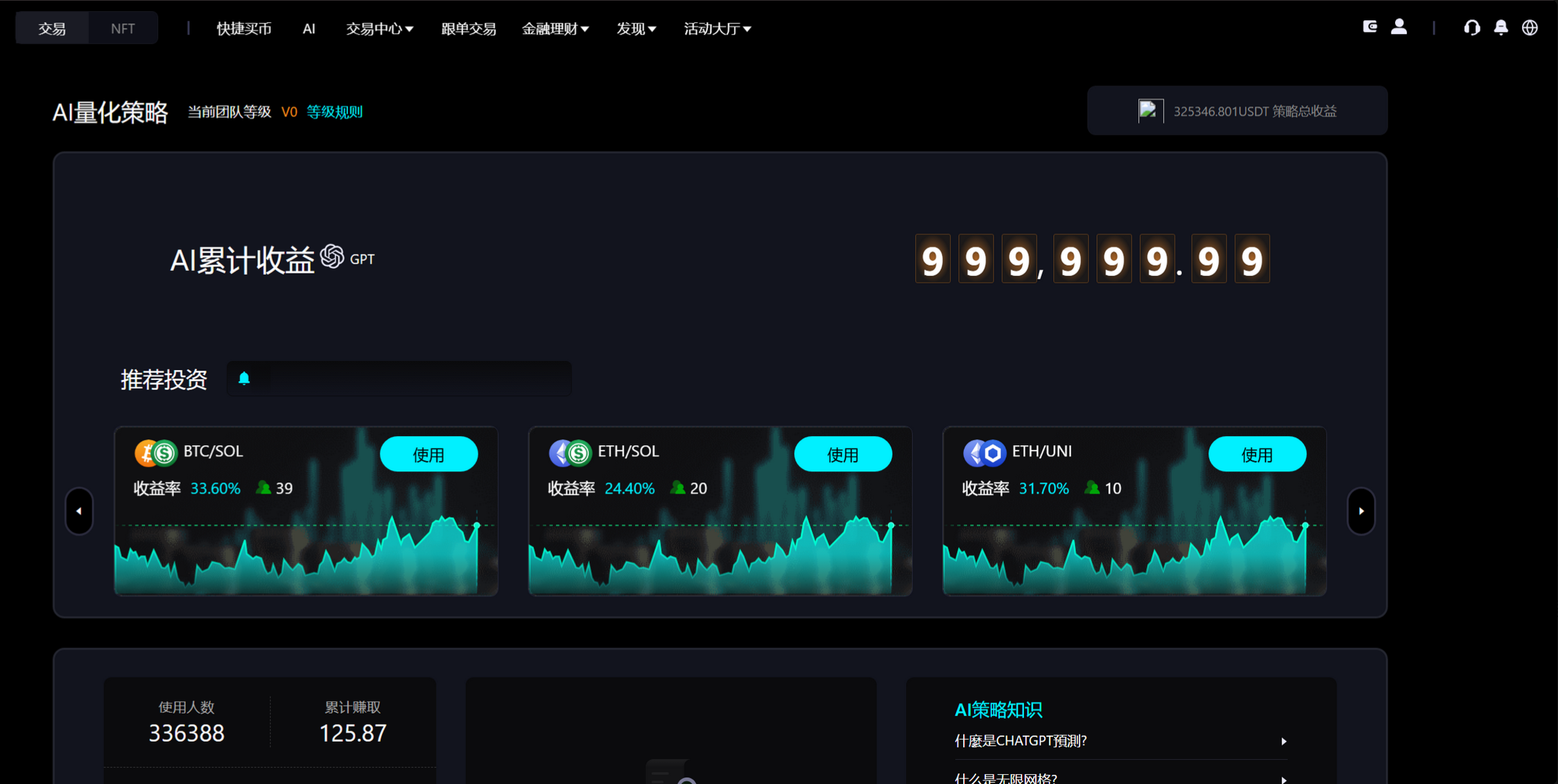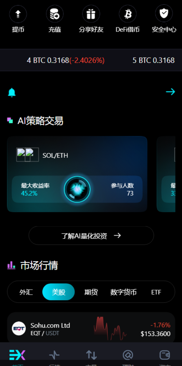 现货交易:币币交易、限价/市价下单、K线图表、委托管理 合约交易:永续合约(125倍杠杆)、交割合约、期权合约、逐仓/全仓模式 C2C交易:法币交易、发布买卖广告、订单管理、多种支付方式 资产管理:充值提币、账户划转、多账户(现货/合约/期权/法币/理财) AI量化:策略广场(网格/马丁/ChatGPT预测)、自动交易、收益统计 跟单交易:跟随交易员、自动/手动跟单、收益查看 理财产品:质押挖矿、流动性挖矿、结构化理财、Defi借贷 新币申购:IEO认购、中签查询、上市提醒 快捷买币:信用卡/银行卡购买、多种法币支持 安全机制:双重密码、邮箱验证、实名KYC、提币审核、异常登录提醒