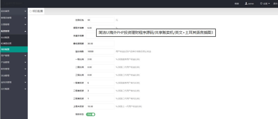 admin APP源码 投资理财 2026-02-11 YM942-PHP程序英文,土耳其语言,简洁UI海外共享贩卖机投资理财源码 简洁UI海外PHP投资理财程序源码/共享贩卖机/英文+土耳其语言 thinkphp程序,支持注册赠金、多级分销,功能很基础,有能力的自行二开。 修复用户管理 运行环境MySQL5.7+PHP7.2+NginX/Apache 暂无优惠当前隐藏内容需要支付3000积分已有0人支付 支付查看 RIPRO主题是一个优秀的主题,极致后台体验,无插件,集成会员系统521博客源码 » YM942-PHP程序英文,土耳其语言,简洁UI海外共享贩卖机投资理财源码