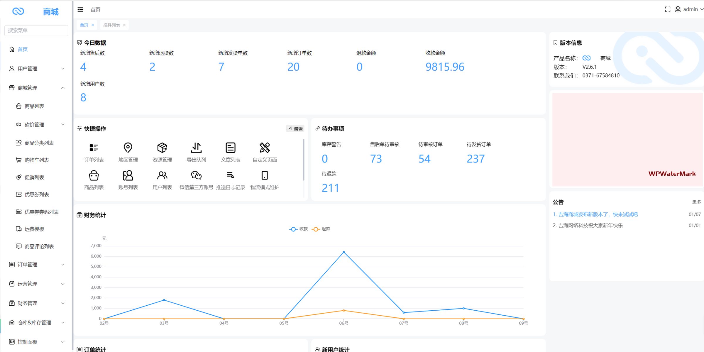 - 控制面板,计划任务、插件、图片、地区、消息、店铺配置、支付方式、配送方式、物流公司管理。