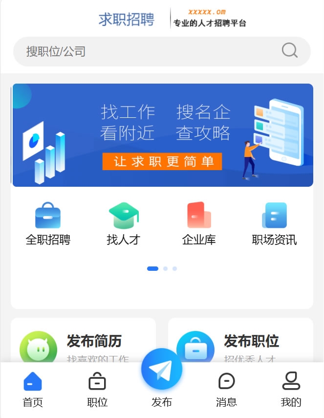 可做成微信小程序,微信公众号,打包成移动端app的功能强大的人才招聘系统,做地方全国求职招聘门户的首选。